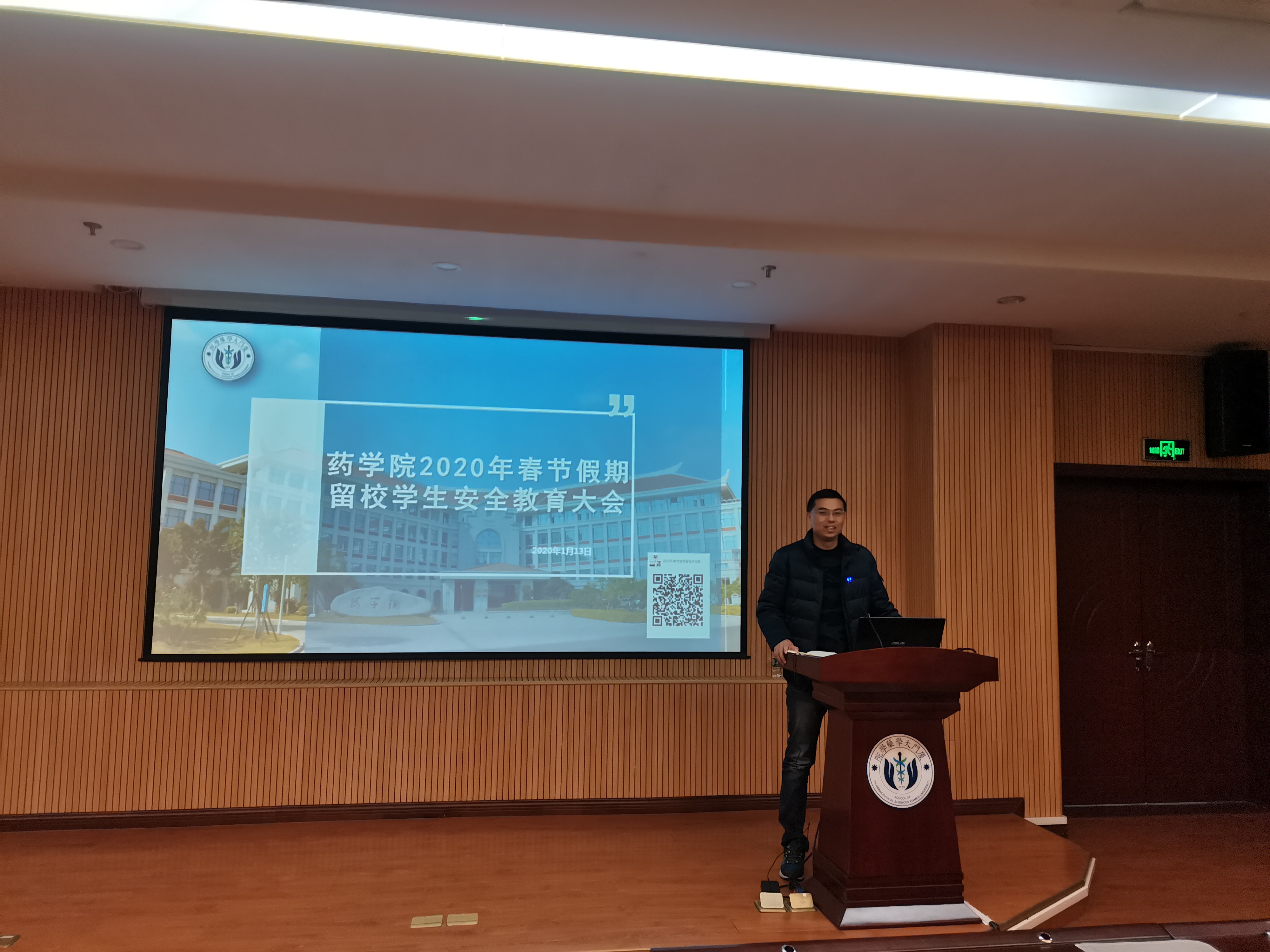 1月13日上午,厦门大学药学院2020年寒假留校学生安全教育大会在庄瑾楼426会议室举行。药学院党委副书记丁昌利、杜超出席会议。大会由学院团委书记陈国全主持。学院全体本、硕、博留校学生参会。