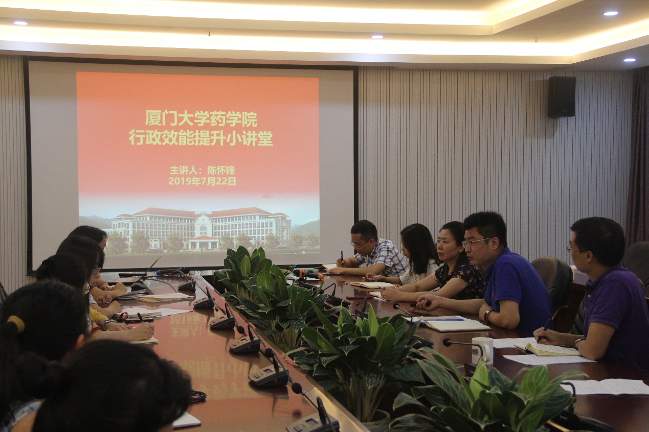 7月22日下午,在520会议室举办了药学院行政效能提升小讲堂的首次讲座。讲座由学院党委书记陈怀锋主讲,党委副书记丁昌利、杜超,以及学院全体党政管理人员到场参加。