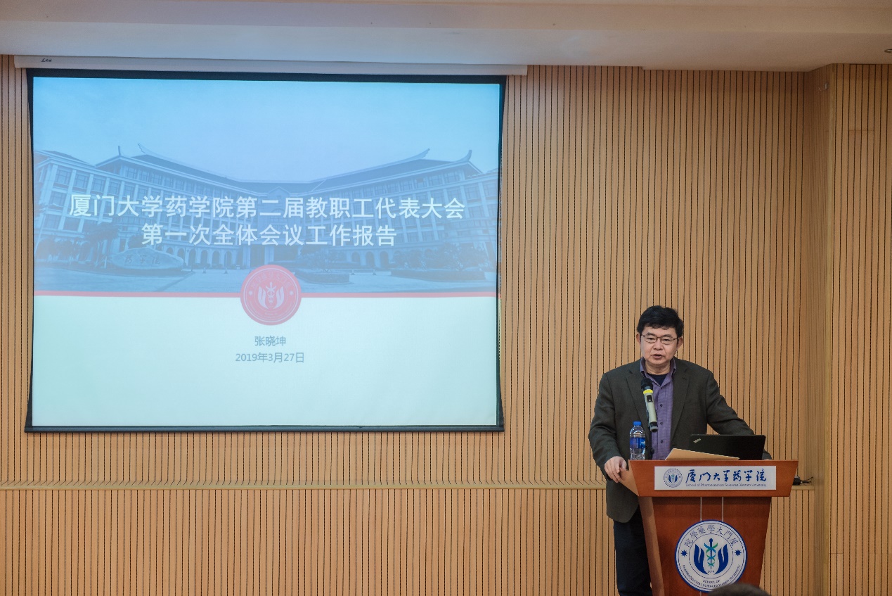 张晓坤院长向大会作学院工作报告,张院长分别从学院党的建设、思想政治工作、学科建设、人才培养、队伍建设、科研建设、社会服务、对外交流等方面总结了学院2018年的工作情况,并对学院2019年的重点工作做出了说明和部署。他强调,2019年是学校深化综合改革、推进“双一流”建设的重要一年,学院要以习近平新时代中国特色社会主义思想为指导,全面贯彻党的十九大精神,认真贯彻落实学校的各项工作部署,发挥学科优势特色,做好药学博士点、专硕点的建设;提高人才培养质量,深化教学改革,推进个性化培养;加强队伍建设,充分发挥一流人才团队的作用;提升科研水平,以国家重大需求为导向,增强原始创新科研能力;增强服务社会能力,继续推动高价值创新成果的转化应用;提高国际化办学水平,促进师生对外交流与合作;全院教职工团结奋进、共同努力,进一步推动学院事业高质量、内涵式发展。