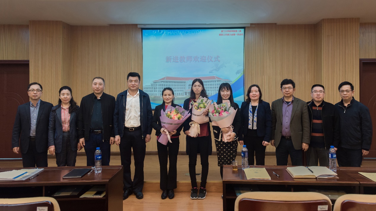 在会上,学院还举行了新进教师欢迎仪式。2018年新加入药学院的三名教师宗利利、夏琳、许定瑜轮流上台作了自我介绍,学院领导向他们赠送了鲜花并合影留念。