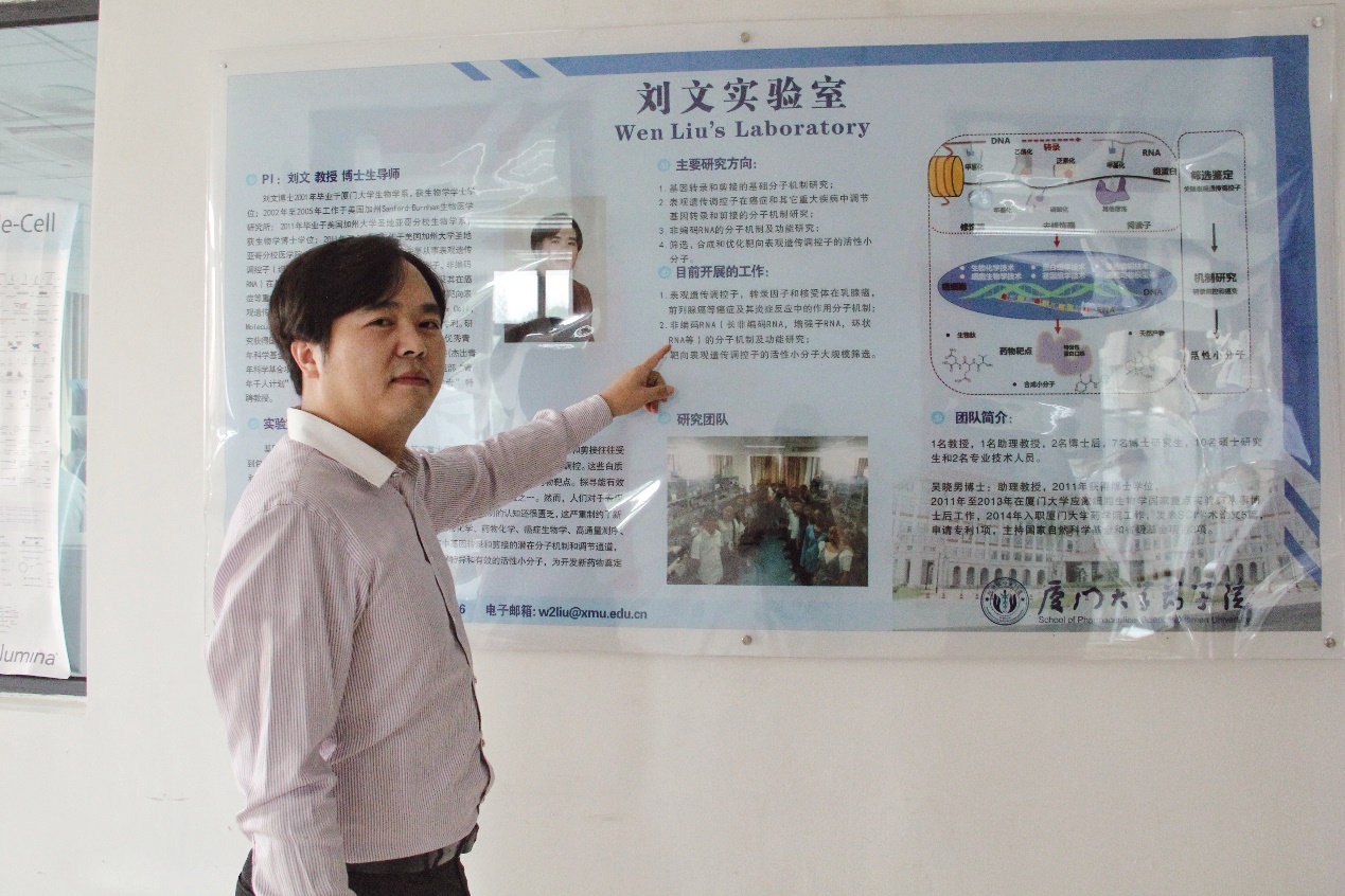 刘文,2001年毕业于厦门大学生物学系,获生物学学士学位;2002年至2005年工作于美国加州Sanford-Burnham生物医学研究所;2011年毕业于美国加州大学圣地亚哥分校生物学系,获生物学博士学位;2011年至2013年工作于美国加州大学圣地亚哥分校医学院;现任厦门大学药学院教授。主要从事癌症等重大疾病中基因转录和剪接的表观遗传调控分子机制研究,致力于探寻靶向表观遗传调控子的活性小分子。是美国2项专利的持有人之一;以第一或者通讯作者发表多篇高水平研究论文,包括Nature,Cell,Cancer Cell,Molecular Cell, PANS等;参与发现的抗癌小分子K-80003方面的研究成果在国际上具有广泛的影响力,该小分子获得了美国FDA的临床批件。