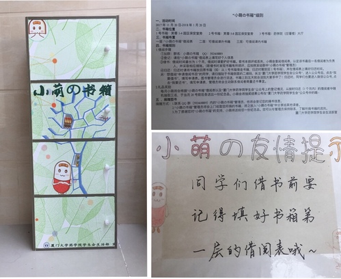 “药小萌”书箱中图书来源一部分由学院统一购置,还有一部分则来自于学院师生的踊跃捐赠。每年毕业季,学院都会在毕业生中开展捐书留言活动,通过向低年级学生捐赠藏书、分享学习体会等方式,实现良好阅读习惯的传承和发扬。与线下实体书箱相结合,学院还利用微信公众平台开展多样的主题活动:“佳书有约”每期推荐一本借阅量较高的图书,线上分享师生们的读书体会,形成以书会友、共话佳书的良好氛围;“小萌送福利”通过每月在读者当中进行抽奖,从而鼓励更多师生积极参与到读书活动当中。
