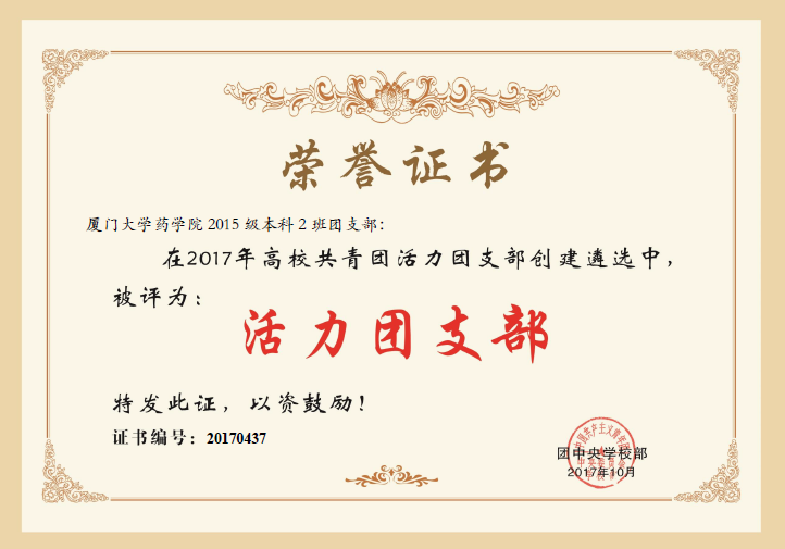 药学院2015级本科2班团支部自成立以来,始终按照“勤学、修德、明辨、笃实”的工作思路,扎实开展社会主义核心价值观教育、支部主题团日、社会实践和志愿服务和其他各类团支部活动,不断创新工作方式,以工作创新提升团支部生机与活力,收到良好成效。该团支部先后获评厦门大学五四红旗团支部标兵、厦门大学优秀班集体、翔安校区体育大比拼先进集体等荣誉称号。支部成员荣获国家级、省级、校级荣誉累计近100人次,在青年团员中产生了广泛和持续的影响力。