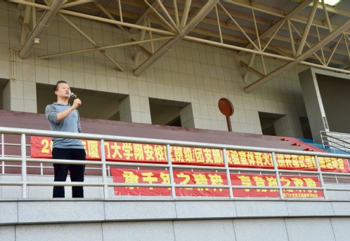 为深入贯彻党的十九大提出的“广泛开展全民健身活动”要求,落实“健康中国2030”规划纲要精神,积极响应团中央“走下网络,走出宿舍,走向操场”的号召,进一步提升翔安校区的群众性体育文化,值欢庆厦门大学成立97周年之际,于4月14日上午,由厦门大学翔安校区团工委主办、药学院学生会承办的2018年厦门大学翔安校区班级/团支部/实验室体育大比拼开幕式暨第五届春季趣味运动会在翔安校区一期田径场成功举办。厦门大学团委副书记兼翔安校区团工委书记洪海松老师、药学院团委书记陈国全老师莅临现场指导。