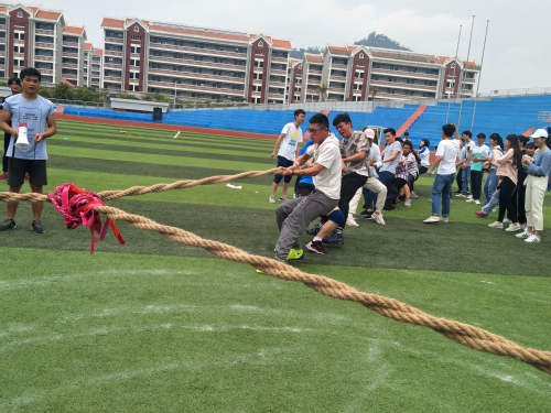 掀起比赛的最高潮的当属压轴项目拔河了!拔河项目集传统与趣味于一身,是本次运动会的重头戏。随着裁判的哨声落下,每支队伍都使出全力,各自喊着自己的节奏“一二一二”,而场外的观众的加油声也是震天响!有的队伍呈现出了压倒性的优势,迅速集中精神用力一致,快速地将绳拉向了自己;有的队伍则在对垒中势均力敌,始终不分胜负。运动员们咬牙坚持的决心和韧劲拧成一股绳,团结就是力量,齐心协力,相信“我们一定能赢”!