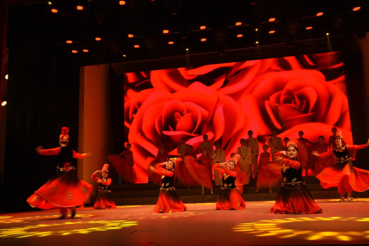 整个表演的形式多样,内容丰富精彩,以一支激情四溢、国家级水准的拉丁舞表演开场,用哈萨克族同学纯熟动听的冬不拉现场弹奏贯穿始终,药学院男教师领衔独唱,深情大气地完美演绎了这首大家耳熟能详的歌曲,尤其是伴以药学院特色的少数民族学生歌舞团原汁原味的新疆舞表演,再加上教师们富有韵律的彩裙伴舞和沙锤伴奏,将整首歌的民族气息烘托渲染到极致。