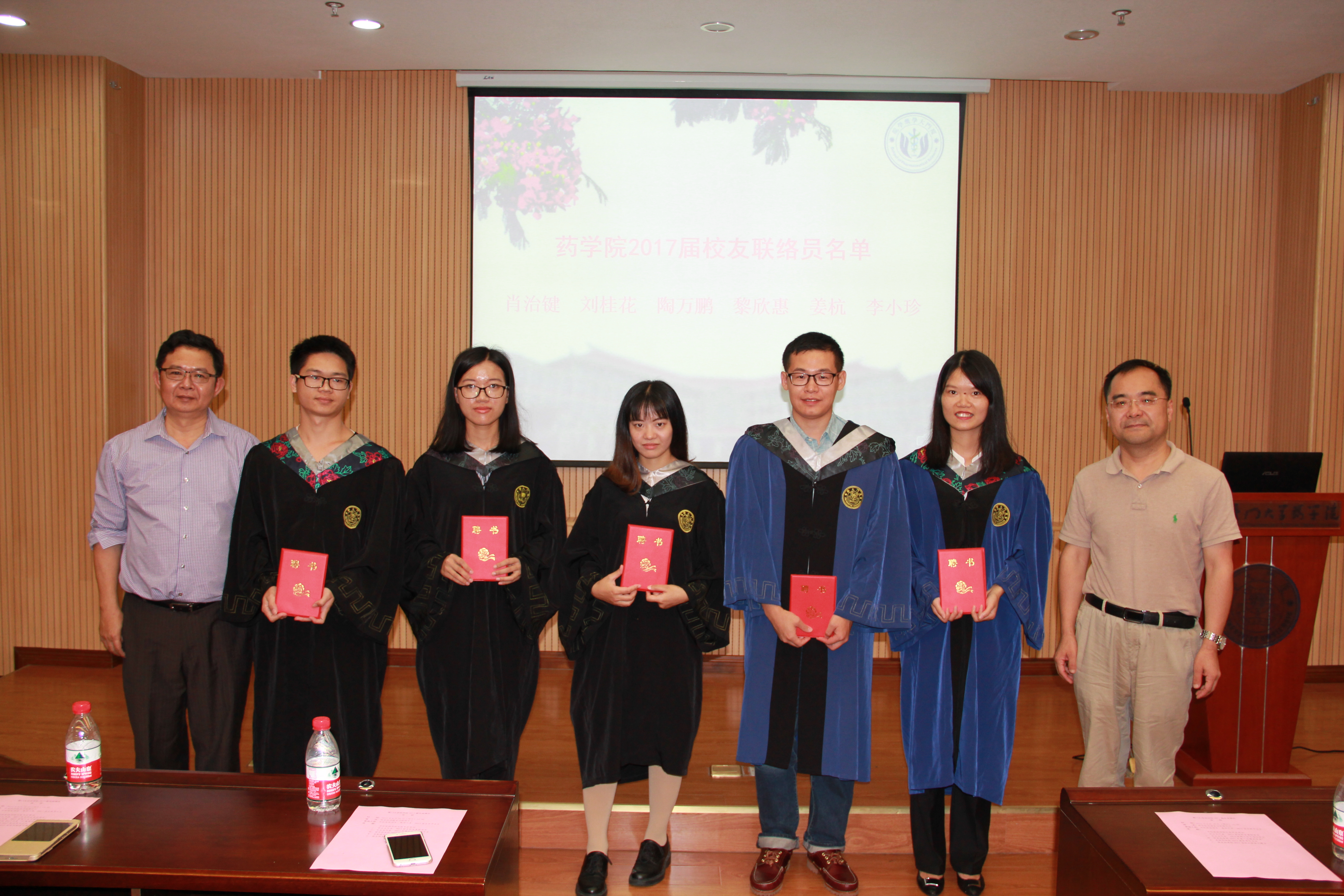 典礼的最后隆重举行了药学院2017届校友联络员聘书颁发仪式。为了加强校友们和学院、学校的联系,肖治键、刘桂花、陶万鹏、黎欣惠、姜杭、李小珍等六位热心为大家服务的同学被聘为学院2017届校友联络员。张晓坤院长、黎永强书记共同为他们颁发了聘书,勉励他们今后为学院校友工作做出更多、更大贡献。