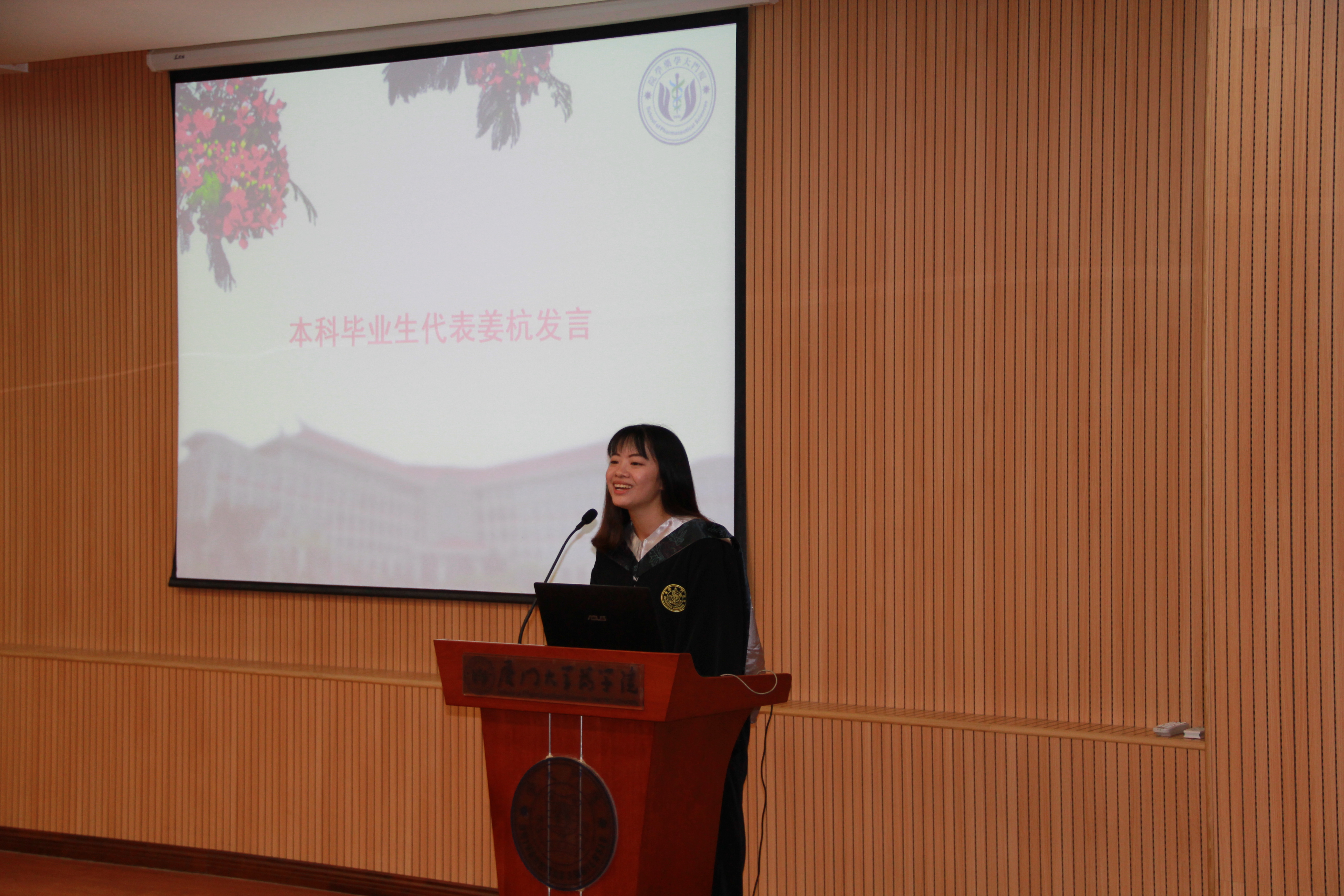 接着,2013级本科生姜杭和2014级研究生王培钰作为毕业生代表发言。他们回忆起几年求学之路上的各种瞬间,感恩学校、学院、师长和同学们对自己的关怀与帮助,她们表示,毕业之际虽有离别的无限感伤,但未来自己一定会全力以赴,为母校争光,为药学院争光。
