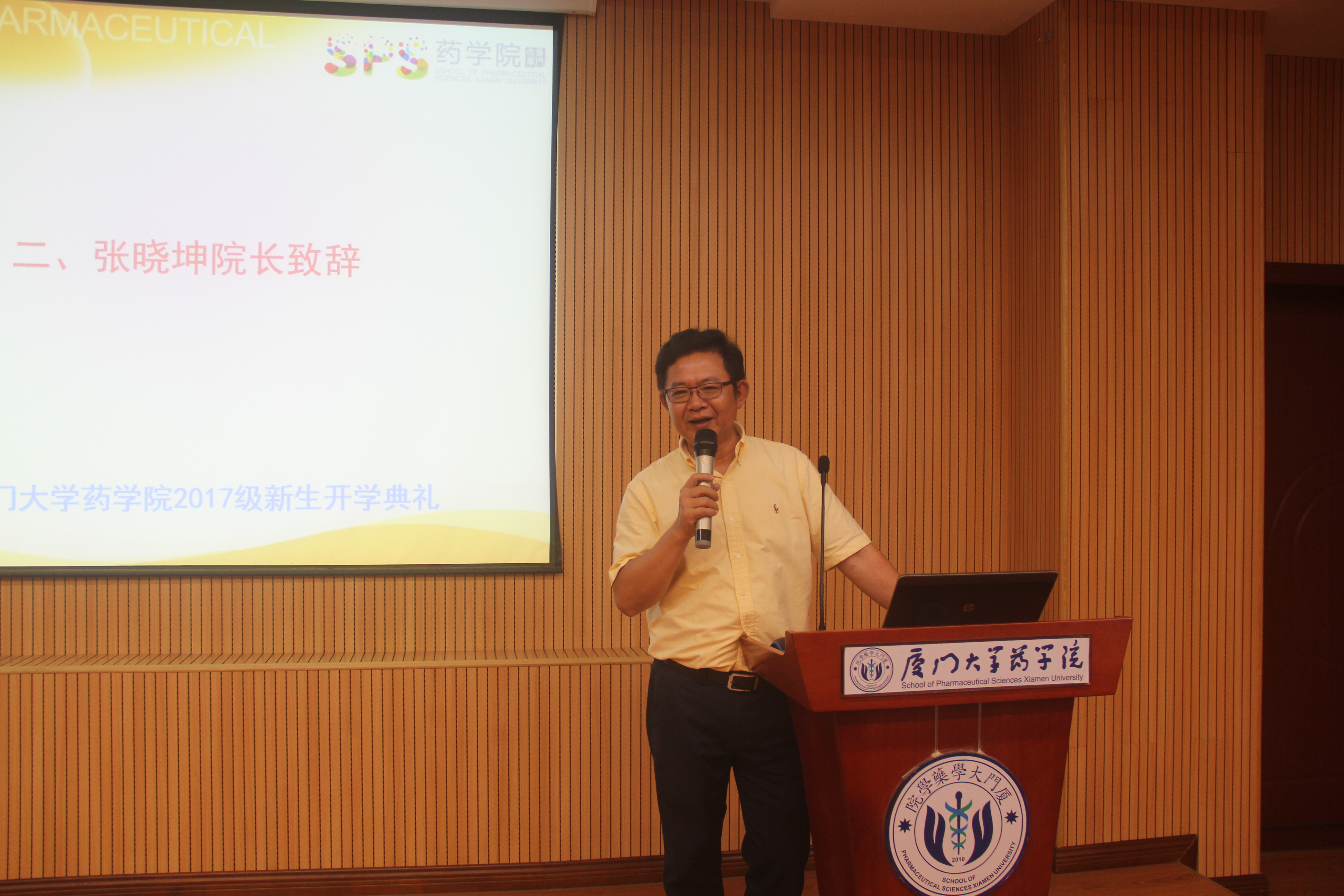 张晓坤院长代表学院热忱欢迎157名2017级新生的到来,并向同学们介绍了年轻而富有朝气的药学院目前整体情况。他说,国家经济的快速发展和人民群众对健康的关注和需求,决定了药学学科未来发展的光辉前景,同学们能来到药学院,三年或四年过后,定能有所收获。他对本科生们说,希望大家从进入大学开始,便积极思考,准确定位,为今后四年的生涯打下好的基础,寻找到属于自己的辉煌未来。他还对研究生们说,学院为大家提供了从事科研工作所需要的一流平台和实验室,同学们应秉承时代使命,把握历史机遇,力争在药学科研的道路上取得突出成绩。