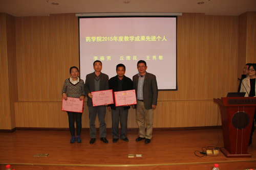 最后,学院对2015年度在教学、科研工作中做出突出贡献的教师进行表彰。王秀敏、李福男、丘鹰昆三位老师获得“教学成果先进个人”。张晓坤获“经费超额奖”,林挺、陈海峰获“论文成果奖”,吕忠显、曾锦章、周强获得“科研绩效奖”。学院党委书记黎永强为获奖教师颁奖并合影留念。