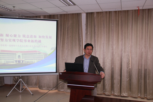 最后,学院工会主席朱铉老师对2013年学院的工会工作做了总结。他指出,2013年学院工会履行职能,充分发挥教代会作用,以人为本,建设温暖的职工之家,很好地发挥了联结教职员工的桥梁纽带作用。在2014年,工会将进一步扮演好为教学科研服务、为教职工服务的角色,团结和调动广大教职员工,为学院的发展做出贡献。