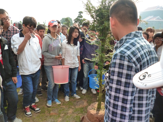 3月16日一大早,参与植树活动的志愿者们就已经带着工具在药学院大楼前集合完毕。在园林工人为志愿者们简单介绍了植树的步骤及注意事项之后,同学们带着各自的工具开始了种植。本次绿化的范围主要是在药学院大楼前的草坪以及动物研究院后面的山坡。种植的树木有红豆杉和凤凰木两种。红豆杉树苗比较矮小便于种植,相对来说,凤凰木的种植难度就比较大了。药学院团委副书记陈国全老师亲临现场进行指挥并参与到植树中来。志愿者们分组进行种植,每个小组三到四人,分工合作,先把树苗放进事先挖好的坑里,然后利用锄头铁锹等工具把土铲进坑内固定好树苗的根部,最后浇水完成种植。因为大家都是第一次种树,对于工具的使用,种植的注意事项还是不够了解,所以园林工人们在一旁进行帮忙和细心指导。