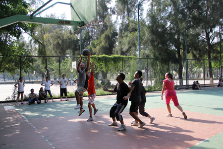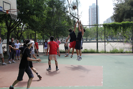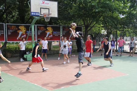 运动员进行了简短的热身后,在活动策划者郭燕冰对比赛规则的说明之后比赛如火如荼地展开了。三人篮球比赛是一种对抗性很强的比赛,但是在女生的参与下增添了许多娱乐的因素。这不,女生接到男生队友的助攻后转身一三八式投篮,球刷网而进便得到两倍于男生的分数,男生们敲敲算盘还是选择恰当的时机给女生队友助攻吧。并且,在场上女生可以防守男生,男生呢,有时候只能眼巴巴地看着对方的女生得4分!还有,男生进攻可得小心啦,如果你上篮时,刹车失灵一头撞上对方的女生,那很抱歉,你们队得倒扣两分哦。