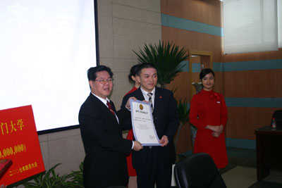 在86周年校庆之际,我校获得了来自福建嘉龙集团1000万元“厚礼”,这笔资金将用于建造厦门大学生物医学研究院的实验楼。4月6日上午,福建省嘉龙集团房地产开发有限公司向厦门大学捐赠人民币1000万元的签字仪式在主楼215室隆重举行,校长朱崇实和嘉龙集团董事长庄凌签署了捐赠协议书。签字仪式由副校长吴世农主持。