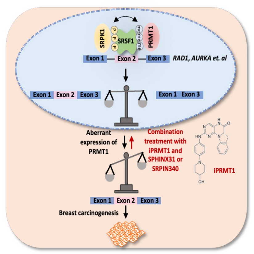 •PRMT1 induces exon inclusion in a number of oncogenes by methylating SRSF1