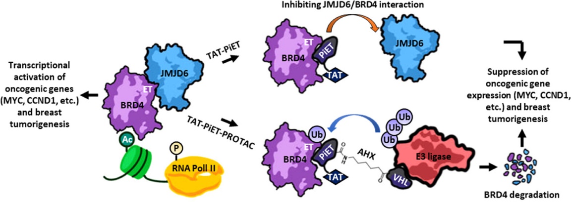 BRD4 is associated with a variety of human diseases, including breast cancer. The crucial roles of amino-terminal bromodomains (BDs) of BRD4 in binding with acetylated histones to regulate oncogene expression make them promising drug targets. However, adverse events impede the development of the BD inhibitors. BRD4 adopts an extraterminal (ET) domain, which recruits proteins to drive oncogene expression. We discovered a peptide inhibitor PiET targeting the ET domain to disrupt BRD4/JMJD6 interaction, a protein complex critical in oncogene expression and breast cancer. The cell-permeable form of PiET, TAT-PiET, and PROTAC-modified TAT-PiET, TAT-PiET-PROTAC, potently inhibits the expression of BRD4/JMJD6 target genes and breast cancer cell growth. Combination therapy with TAT-PiET/TAT-PiET-PROTAC and JQ1, iJMJD6, or Fulvestrant exhibits synergistic effects. TAT-PiET or TAT-PiET-PROTAC treatment overcomes endocrine therapy resistance in ERα-positive breast cancer cells. Taken together, we demonstrated that targeting the ET domain is effective in suppressing breast cancer, providing a therapeutic avenue in the clinic.