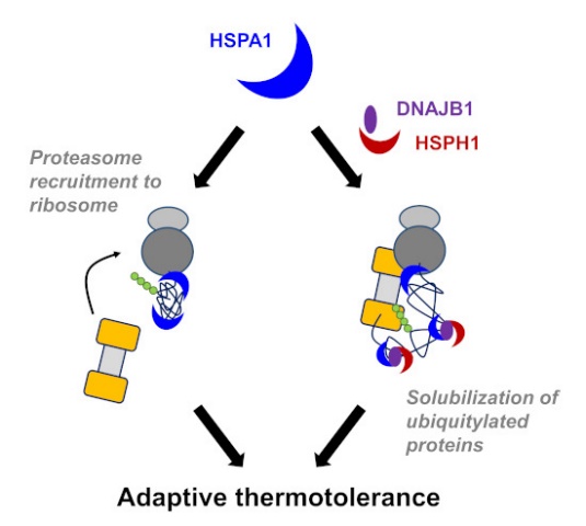 How cells exposed to heat stress acquire thermotolerance is poorly understood. Here, quantitative proteomics identifies upregulation of HSP70-family chaperone HSPA1, which fulfills dual function in quality control of nascent proteins at translating ribosomes.