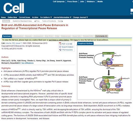 Professor Liu Wen published a paper entitled:“Brd4 and JMJD6-Associated Anti-Pause Enhancers in Regulation of Transcriptional Pause Release”on Cell